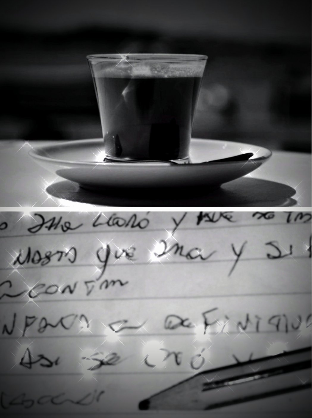 Mientras tanto, el lápiz y el cuaderno ávidos de letras, un cortado en jarrito que se deja saborear, la musa que inspira, espía desde la barra del bar.